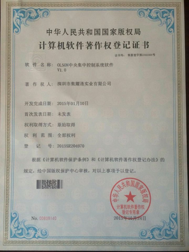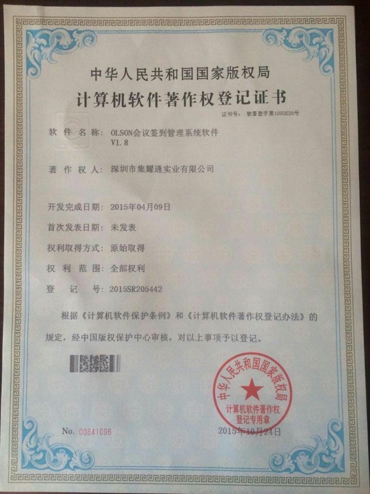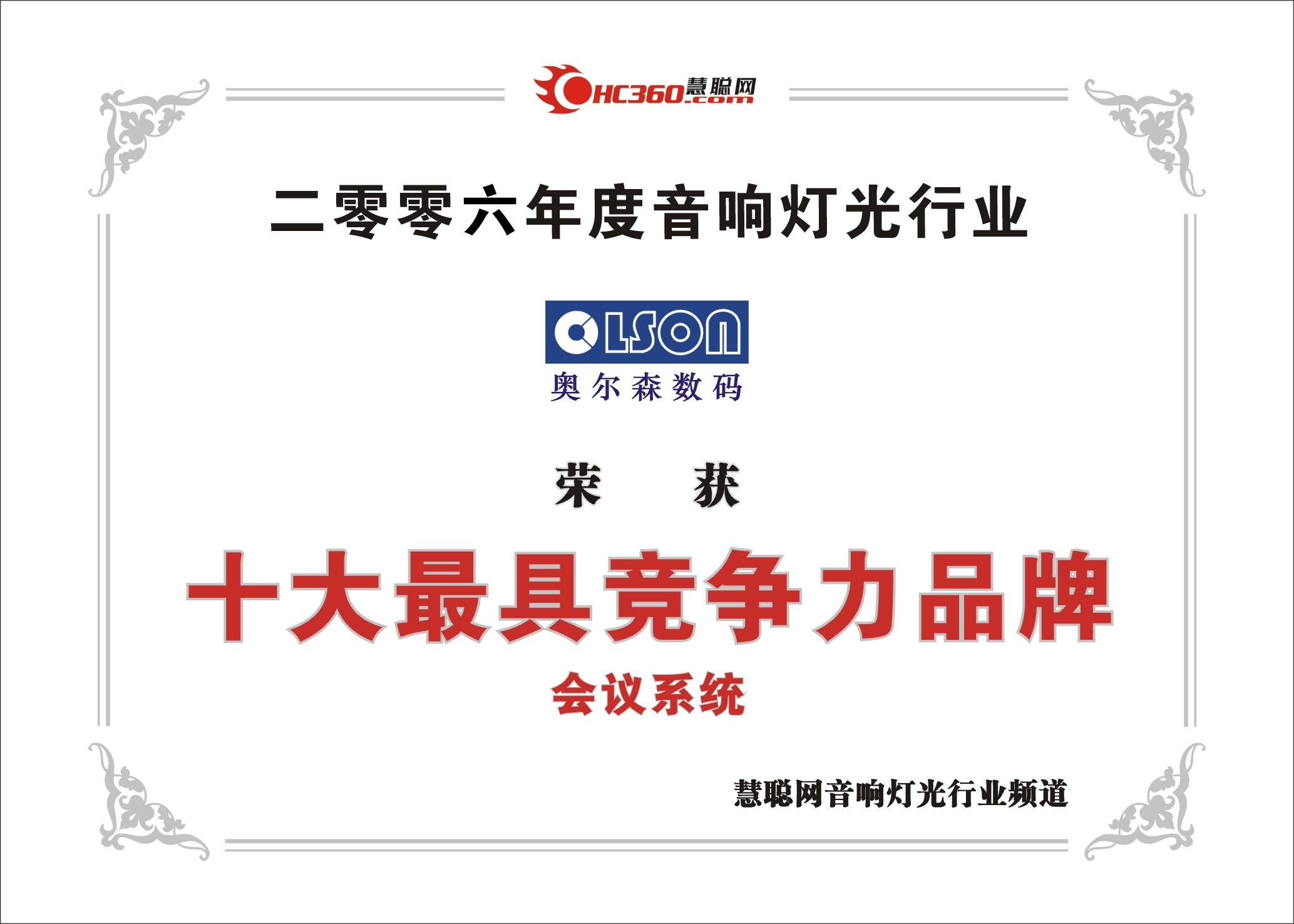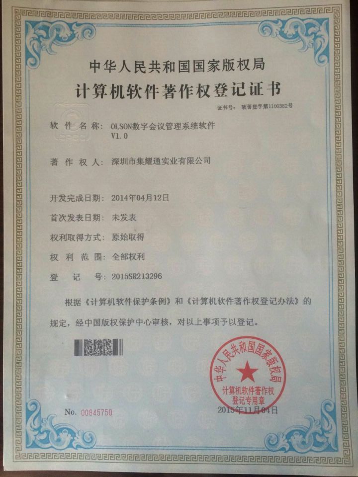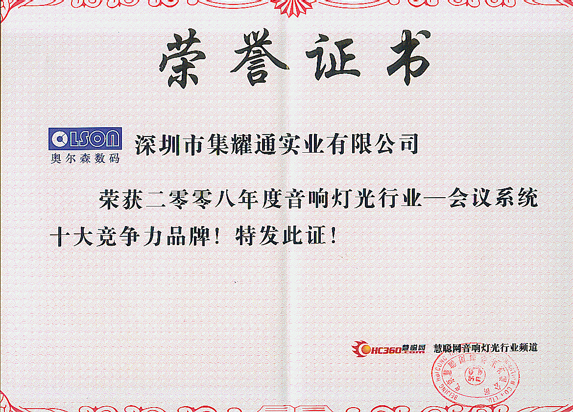 合作基础上获得OLSON商标中国地区使用权。为OLSON(奥尔森)入驻国内市场起决定性因素,后期也让深圳市集耀通实业公司开启了全新的企业发展模式;更为国内会议系统行业成就了一家专业从开发、设计、生产、独立技术与服务为一体的全方位服务型供应商!